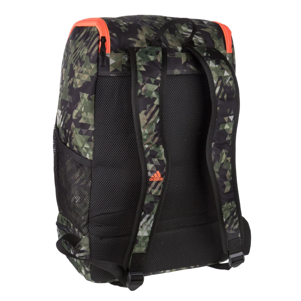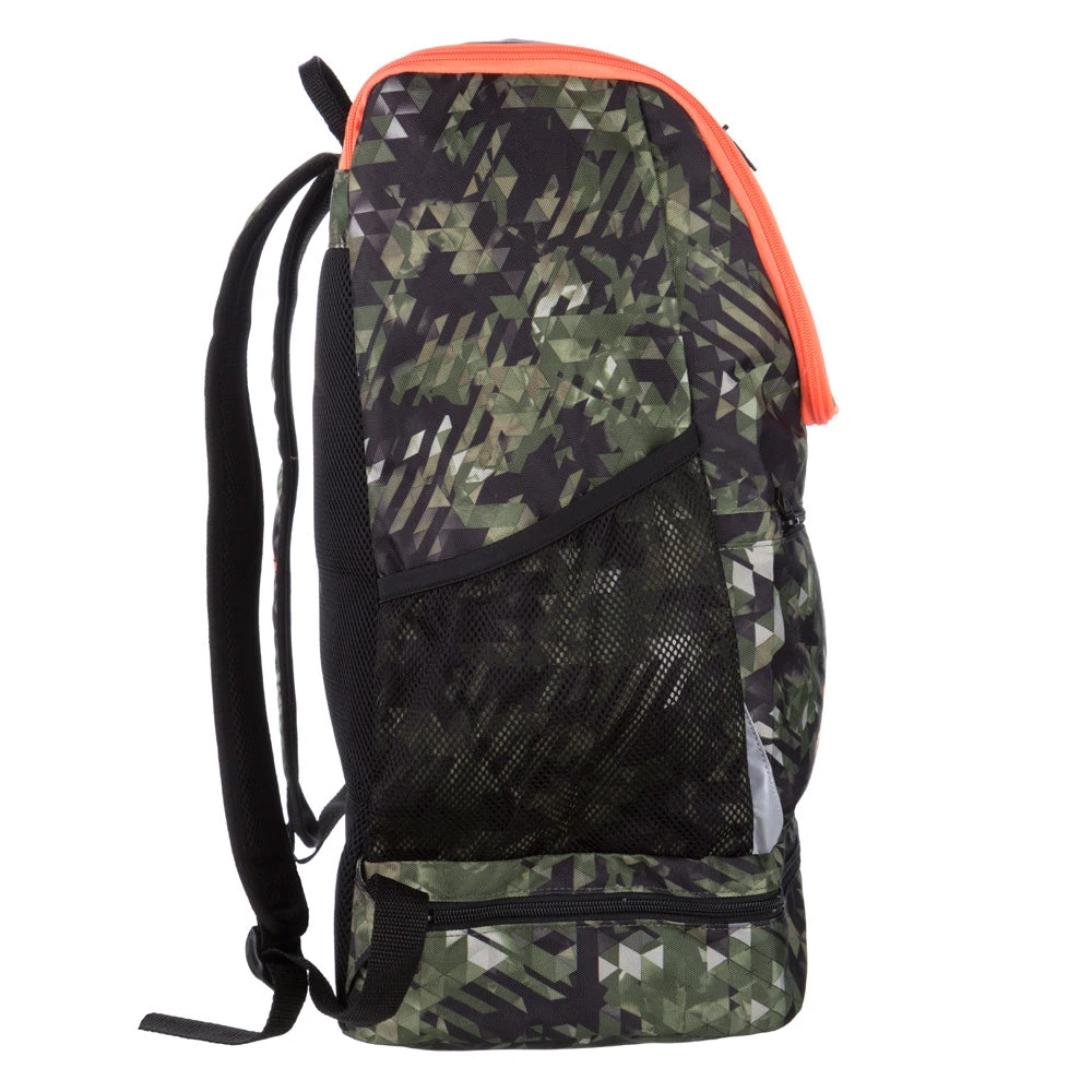 These Camoflague backpack features one large main compartment with contrast orange color zipper and three zipper pockets outside.