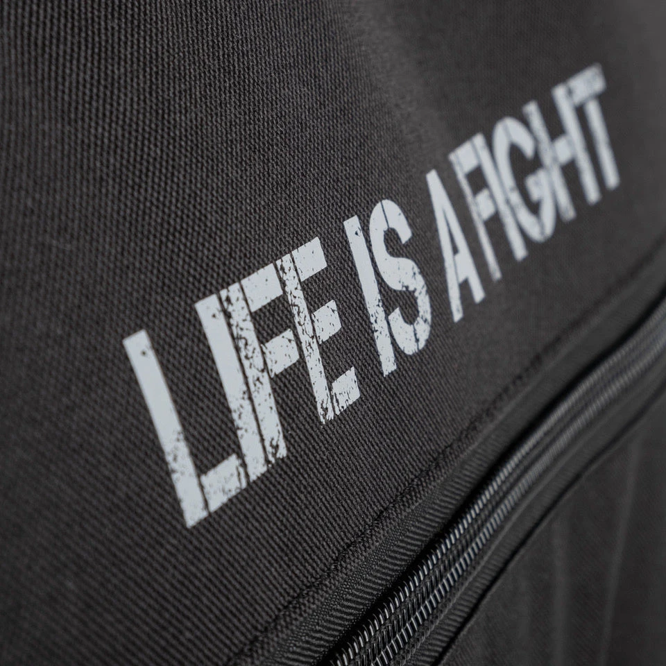 The Fighter universal sports bag is made in the Czech Republic. The material is waterproof polyester. The bag has two side pockets on each side. You can find more pockets inside. The bag can be carried in the hand, over the shoulder and as a backpack. The back straps are in a hidden pocket at the bottom of the bag. The bottom of the bag is padded. There is enough room for carrying all necessary equipment for your training.
