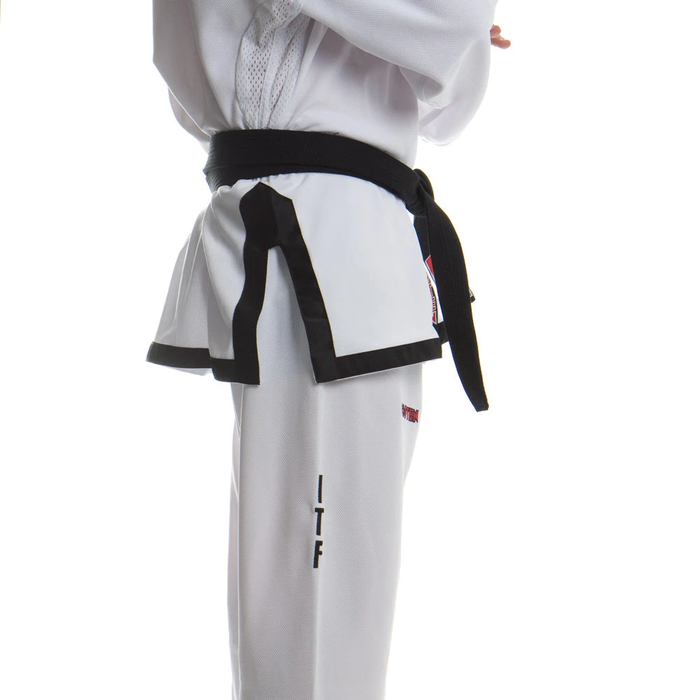 A new TOP TEN ITF Instructor competition uniform made of a very light and comfortable Poly Mesh sweat absorbent fabric. Excellent ventilation. High quality uniform design for 1.-3.dan.